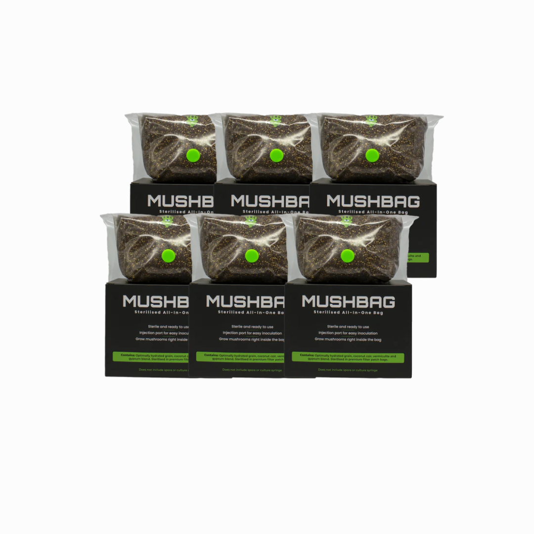 Whether you’re an experienced commercial cultivator or it’s your first time growing, we’ve got you covered with everything you need – from a perfect blend of substrate, a humidity controlling grow tent, and essential supplies – all in one convenient package. Featuring a proprietary blend of grain and substrate within a single, sterilised grow bag, this innovative design allows you to grow mushrooms directly inside the bag, without the hassle of complex setups, slow growth, or contamination risks.
